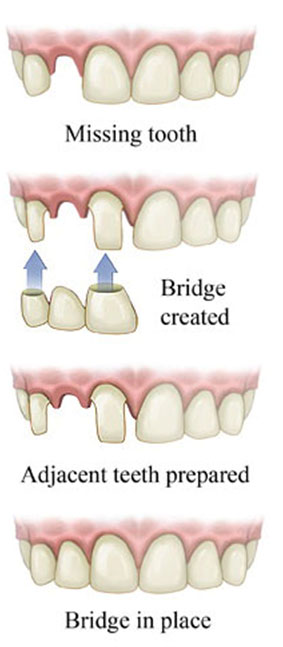 Maryland Bridges are made of ceramic teeth and gums supported by a metal framework. Metal wings on each side of the bridge are bonded to your existing teeth. (Also known as a resin-bonded bridge or a Maryland Bridge).